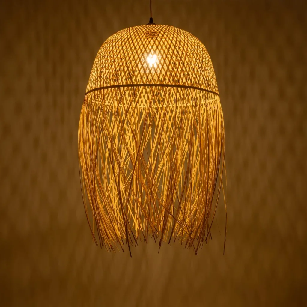 GloboStar® MANILA 01713 Boho Κρεμαστό Φωτιστικό Πλέγμα Μονόφωτο 1 x E27 IP20 Μπεζ Ξύλο – Μ25 x Π25 x Υ60cm