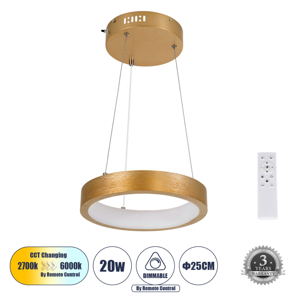 GloboStar® NEMESIS 61154 Κρεμαστό Φωτιστικό Δαχτυλίδι-Κύκλος LED CCT 20W 2356lm 360° AC 220-240V – Εναλλαγή Φωτισμού μέσω Τηλεχειριστηρίου All In One Ψυχρό 6000k+Φυσικό 4500k+Θερμό 2700k Dimmable Φ25cm – Χρυσό Βούρτσας – 3 Years Warranty