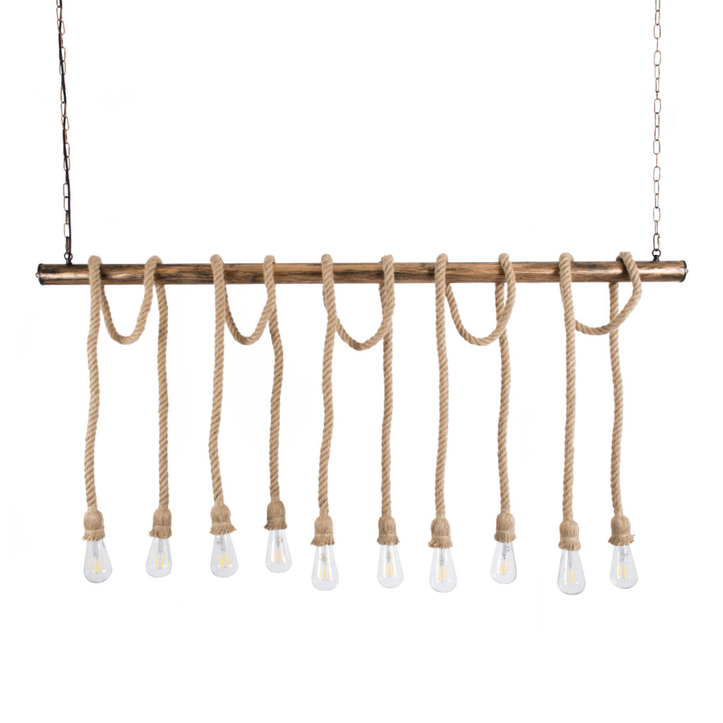 GloboStar® RAILROAD 01380 Vintage Κρεμαστό Φωτιστικό Ράγα Πολύφωτο 10 x E27 IP20 Χάλκινο Μέταλλο με Μπεζ Σχοινί – Μ150 x Π4 x Y62.5cm