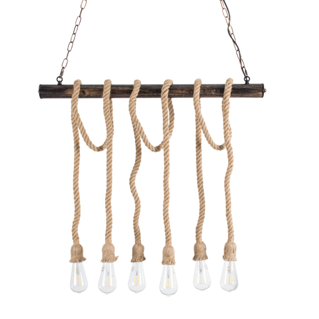 GloboStar® RAILROAD 01379 Vintage Κρεμαστό Φωτιστικό Ράγα Πολύφωτο 6 x E27 IP20 Χάλκινο Μέταλλο με Μπεζ Σχοινί – Μ80 x Π4 x Y55cm