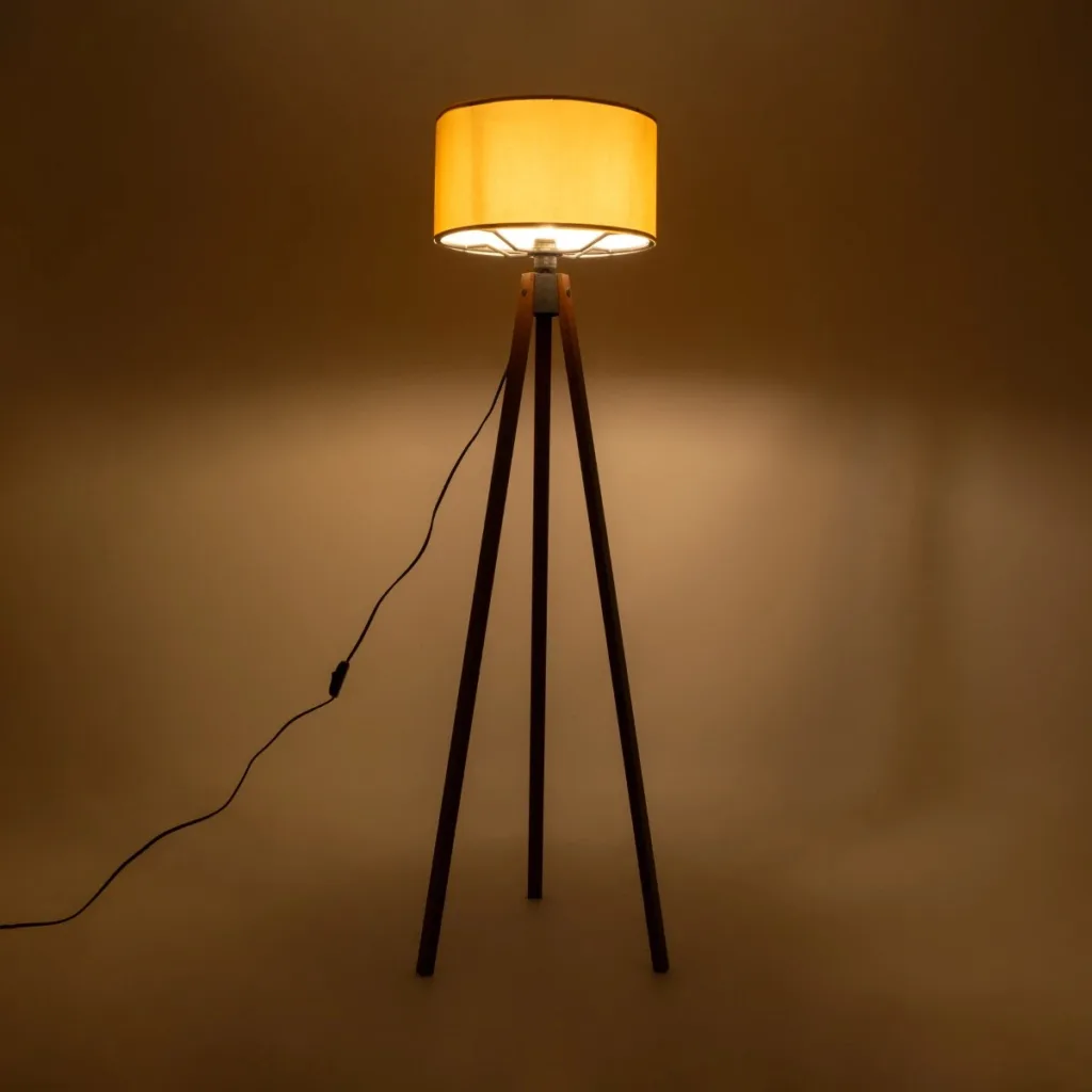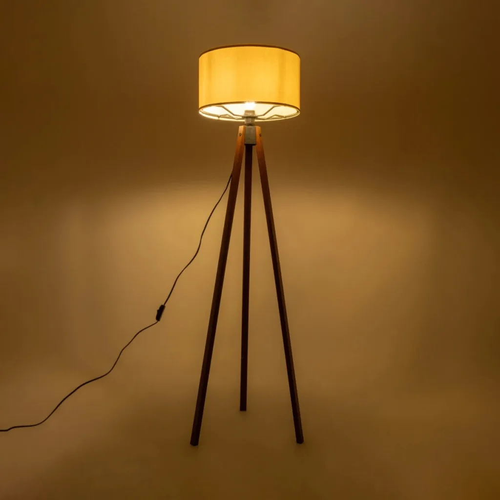 GloboStar® SAGA 204-0033 Μοντέρνο Eπιδαπέδιο Φωτιστικό Μονόφωτο 1 x E27 IP20 Καρυδί Ξύλο με Κίτρινο Ύφασμα – Μ38 x Π38 x Υ140cm