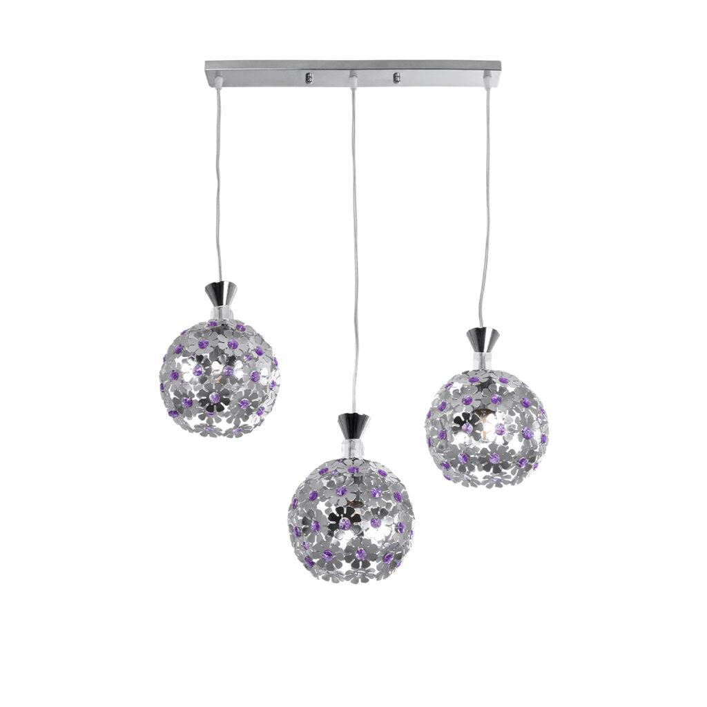 GloboStar® BOUQUET 01249 Μοντέρνο Κρεμαστό Φωτιστικό Μπάλα Τρίφωτο 3 x E27 IP20 Ασημί Μέταλλο με Μωβ Κρύσταλλο – Μ66 x Π19 x Υ24cm