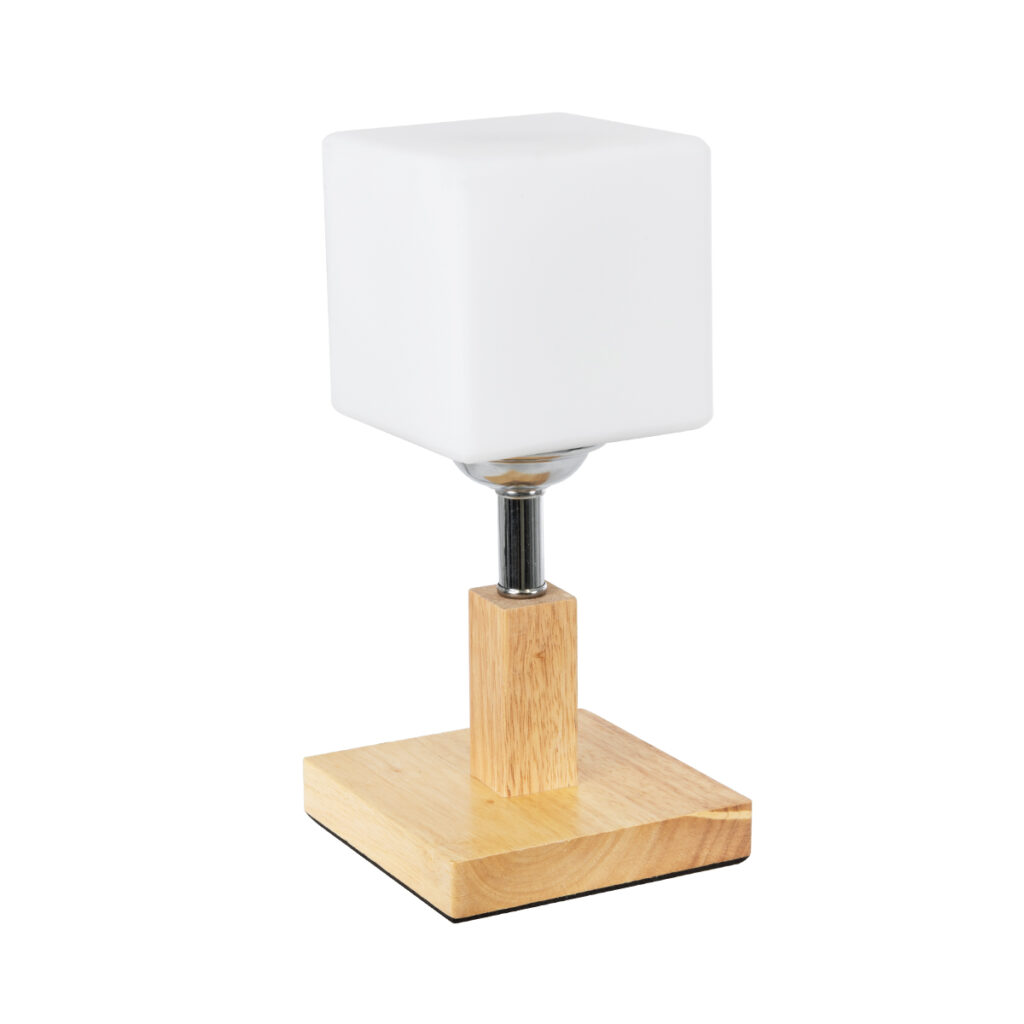 GloboStar® COVE 02037 Μοντέρνο Επιτραπέζιο Φωτιστικό Μονόφωτο 1 x E27 AC220-240V IP20 – Μ12 x Π12 x Υ25cm – Μπεζ Ξύλινο & Γυάλινο Γαλακτερό Κύβο