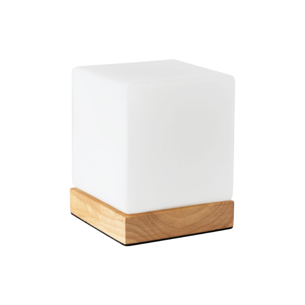 GloboStar® DERYA 02035 Μοντέρνο Επιτραπέζιο Φωτιστικό Μονόφωτο 1 x E27 AC220-240V IP20 – Μ12 x Π12 x Υ15cm – Μπεζ Ξύλινη Βάση με Λευκό Γαλακτερό Γυαλί