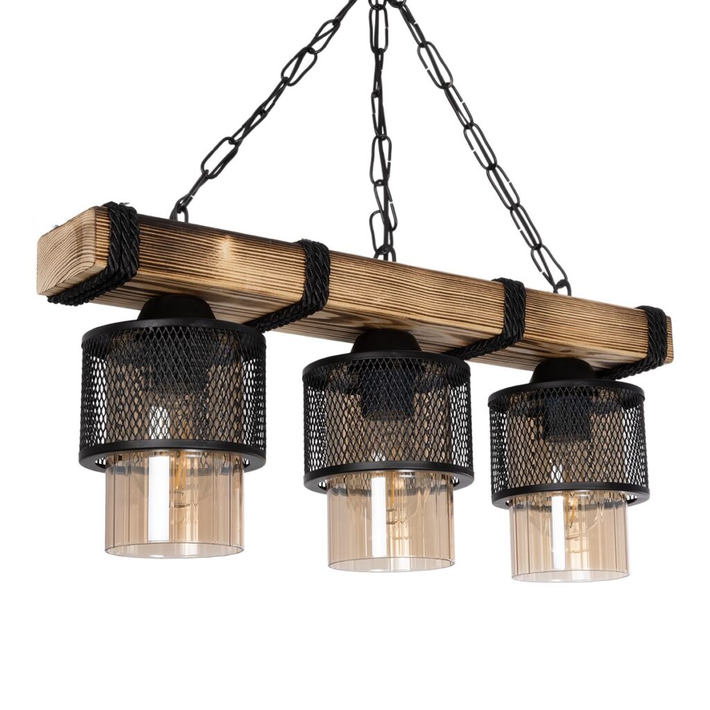 GloboStar® GLORA 201-0009 Vintage Κρεμαστό Φωτιστικό Ράγα Τρίφωτο 3 x E27 IP20 Μπεζ Ξύλο με Μαύρο Μέταλλο & Μελί Γυαλί – Μ50 x Π16 x Υ65cm