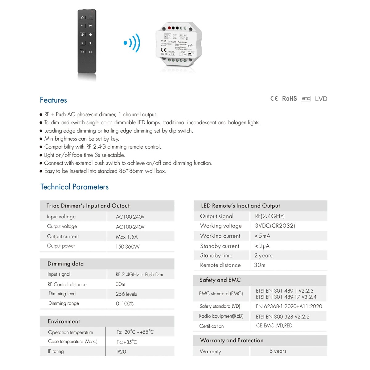 GloboStar® 73125 S1-B+R1 SKYDANCE ΣΕΤ Dimmer & Ασύρματο Χειριστήριο Αφής 1 Group RF 2.4Ghz 1.5A Max AC100-240V (360W) – DC 3V IP20 – 5 Χρόνια Εγγύηση