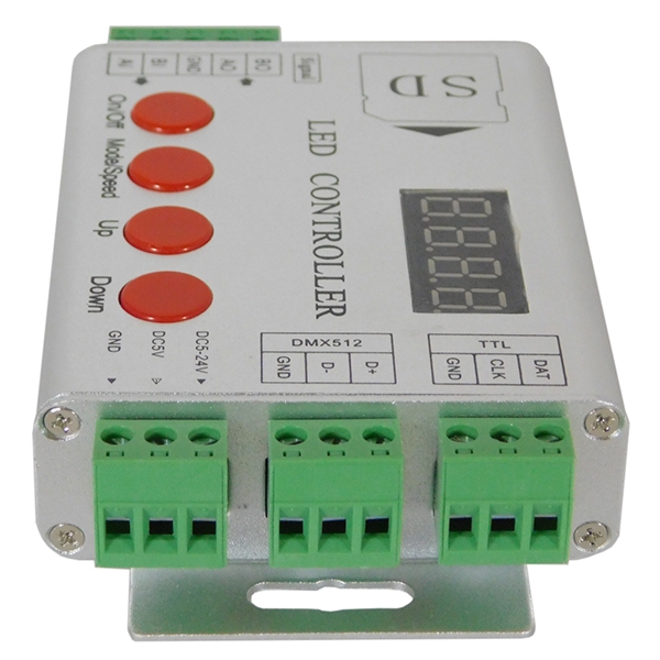 Ο GloboStar® 73444 LED Digital RGB Controller DMX512 & Κάρτα SD για LED Digital RGB Προϊόντα 5v – 12v – 24v HC03 2048 IC έχει εγκατεστημένα 123 βασικά προγράμματα λειτουργίας και ειδικά εφέ φωτισμου. Επίσης υπάρχει η δυνατότητα εγγραφής προγράμματος με ειδικά εφέ της αρεσκείας σας με το πρόγραμμα Led Edit. Ανάλογα με την κατασκευή και την εγκατάσταση σας, ο συγκεκριμένος controller έχει την δυνατότητα αναπαραγωγής κυλιόμενου μηνύματος ή αρχείου Video.