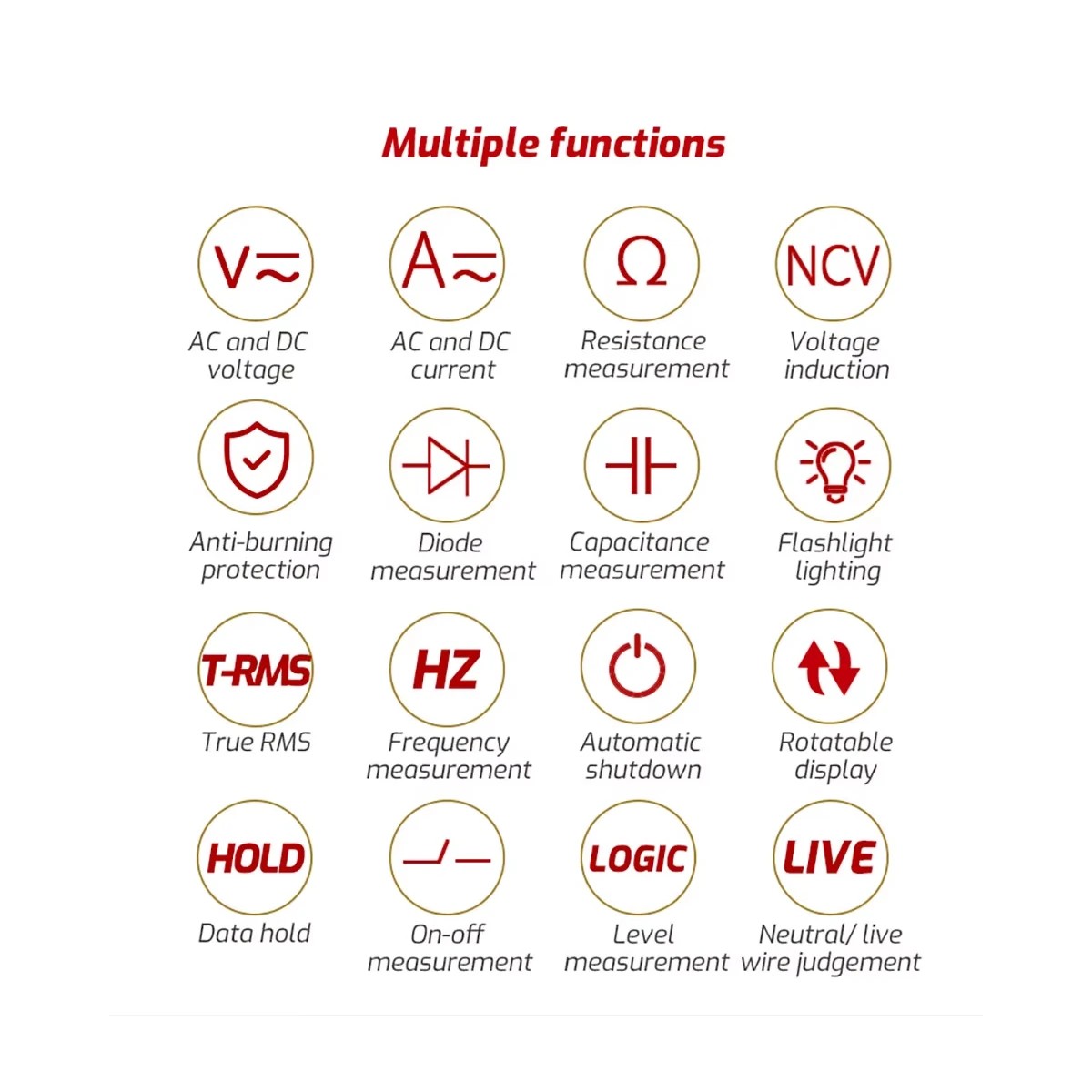 Functions – Λειτουργίες : AC Voltage, DC Voltage, Resistance, NCV, Anti-burning protection, Diode, Capacitance, Flashlight, True RMS, Frequency, Automatic Shutdown, Rotatable display, Data Hold, On-Off, Level, Neutral/ Live Wire Check