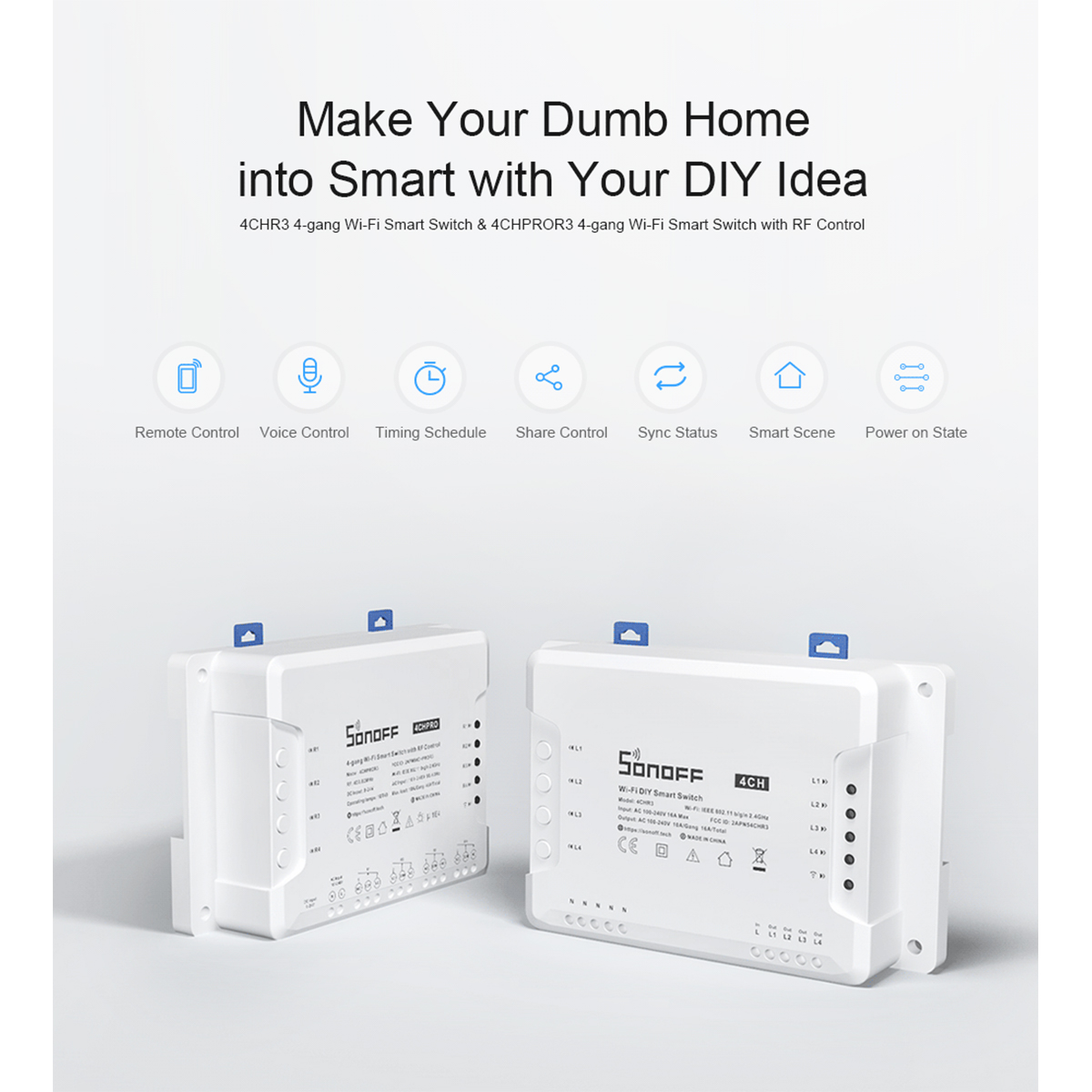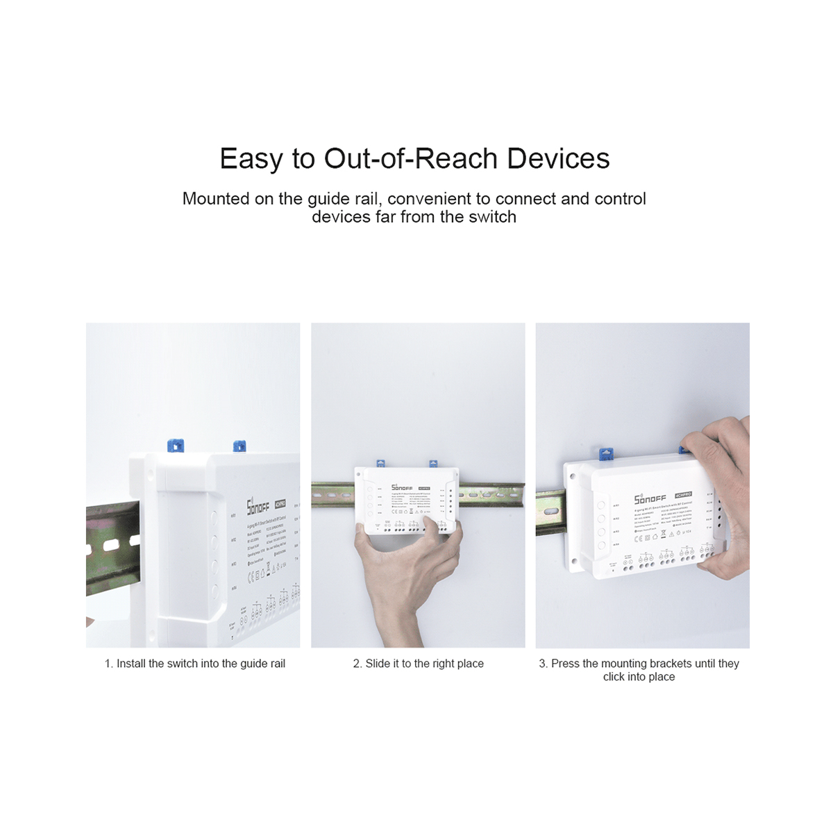 Extra Informations – Επιπλέον Πληροφορίες : The new improvement on 4CHR3 and 4CHPROR3 compared with 4CHPR2 and 4CHPROR2 is for users to set these 3 working modes on eWeLink APP instead of the hardware itself, easier to operate. So you can enable self-locking mode to turn on/off 4 connected devices separately, interlock mode to turn on 1 connected device every time and turn off the rest of devices simultaneously and inching mode to turn on 1 connected device and then make it turn off automatically after a given time (0.5 – 3600s). For the device away from the switch, you can create a moveable space in virtue of a DIN rail to make them be connected. Simply activate devices through your voice when the switch works with Alexa and Google Home smart assistant.
