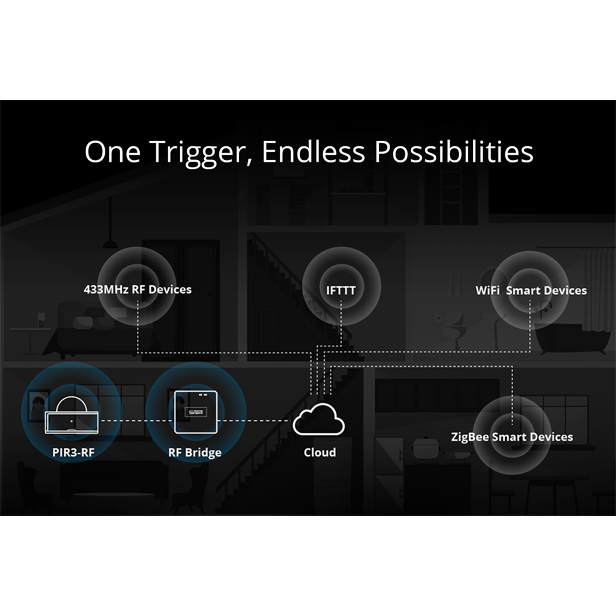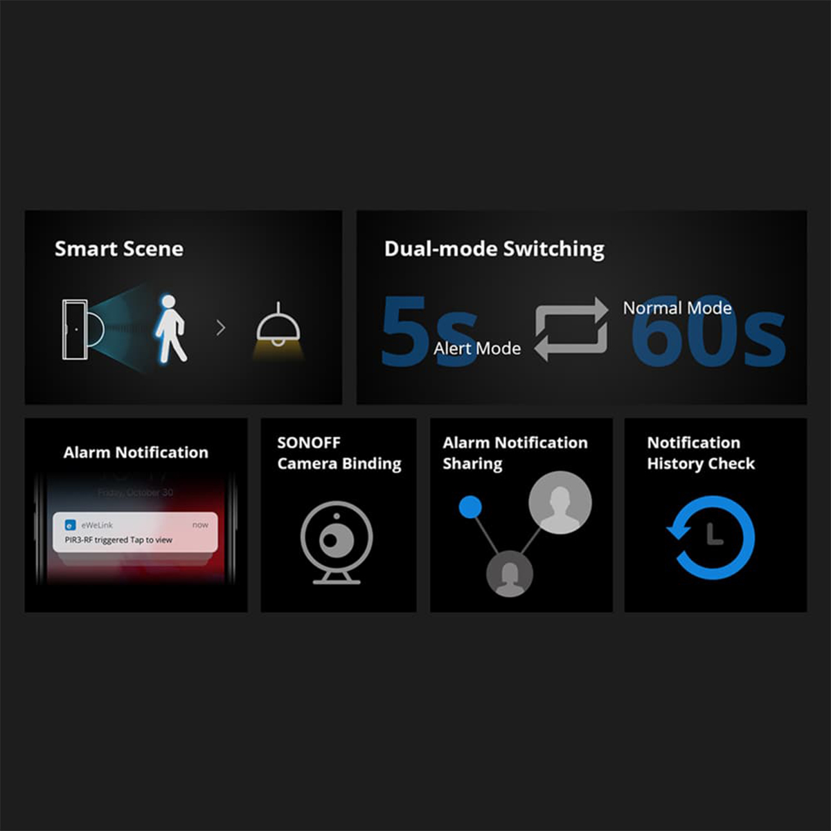 Extra Informations – Επιπλέον Πληροφορίες : Pick up in Only 3 Steps 1) Access the RF Bridge page in the eWelink APP, select to add an alarm, and the Bridge makes a “Beep” that indicates it enters the RF learning mode. 2) Wave to PIR3-RF to make it activated (The LED indicator flashes red for 1s). 3) The RF Bridge makes “Beep Beep” that indicates the RF learning is successful.
