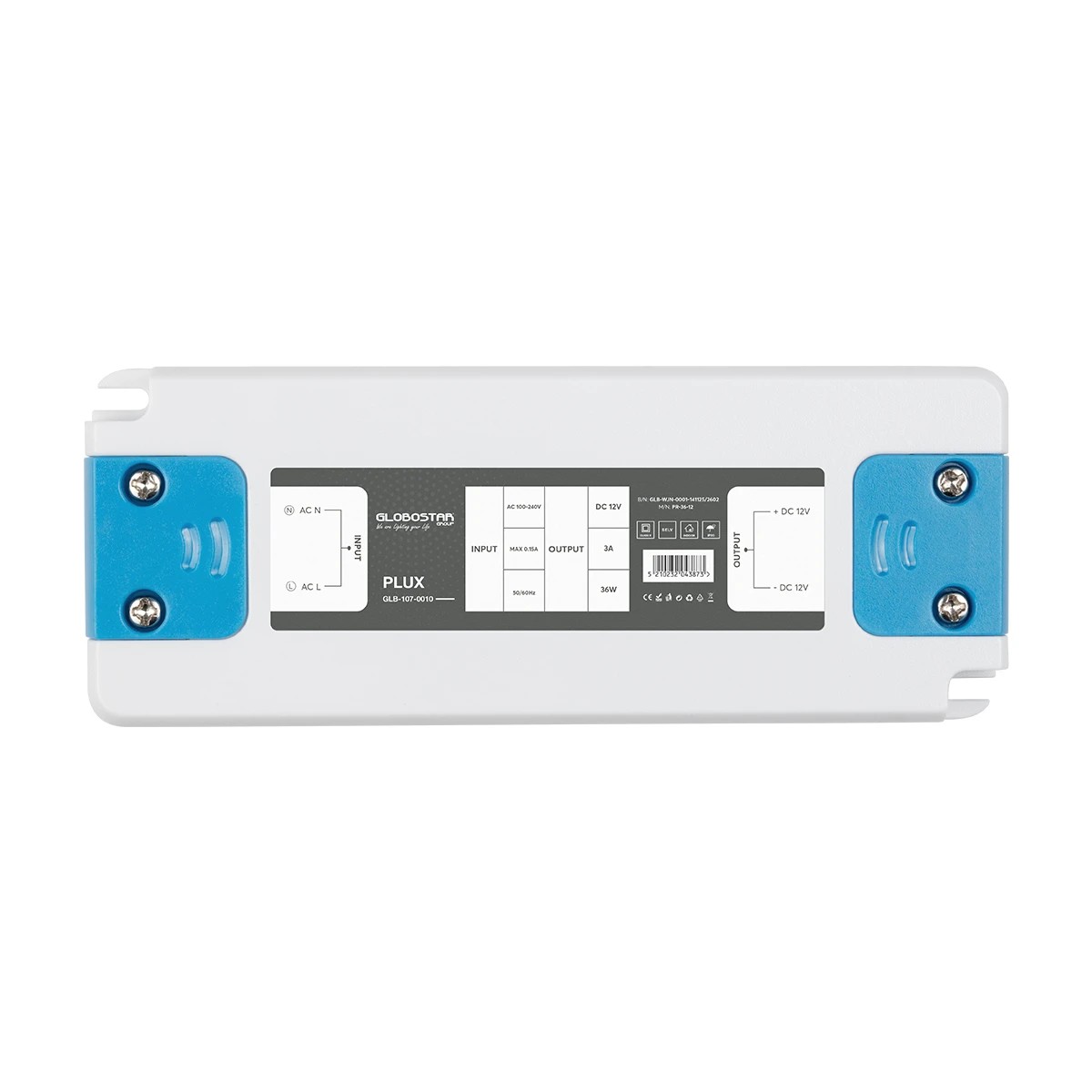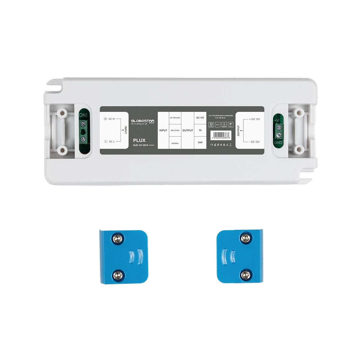 GLOBOSTAR® PLUX GLB-107-0010 Τροφοδοτικό/Μετασχηματιστής Class II SELV 36W 3A AC 220-240V σε DC 12V IP20 – Λευκό Ματ – Μ12.8 x Π5 x Υ1.5cm – 3 Χρόνια Εγγύηση
