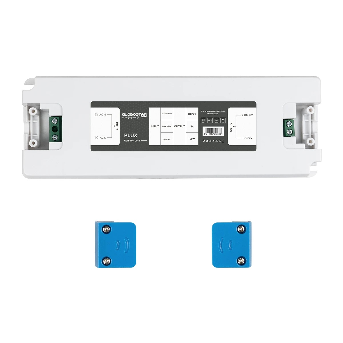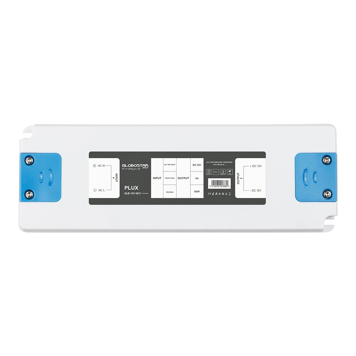 GLOBOSTAR® PLUX GLB-107-0011 Τροφοδοτικό/Μετασχηματιστής Class II SELV 60W 5A AC 220-240V σε DC 12V IP20 – Λευκό Ματ – Μ18.5 x Π6.4 x Υ2.2cm – 3 Χρόνια Εγγύηση