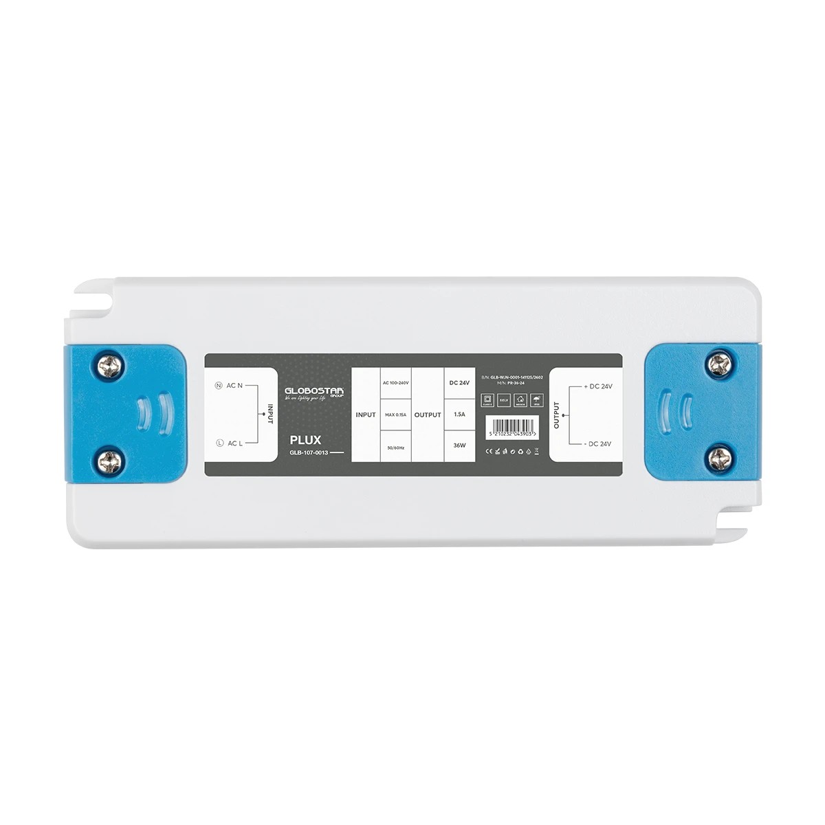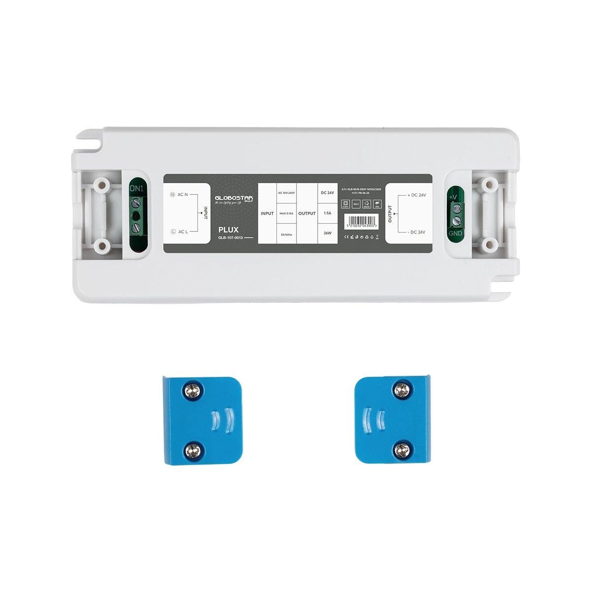 GLOBOSTAR® PLUX GLB-107-0013 Τροφοδοτικό/Μετασχηματιστής Class II SELV 36W 1.5A AC 220-240V σε DC 24V IP20 – Λευκό Ματ – Μ12.8 x Π5 x Υ1.5cm – 3 Χρόνια Εγγύηση