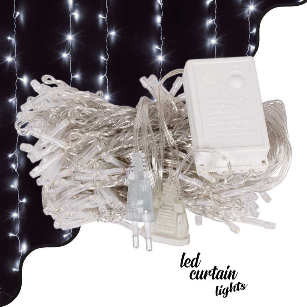 85804 Διακοσμητική Κουρτίνα 3 x 3 Μέτρα με Controller 8 Προγραμμάτων Φωτισμού – Επεκτεινόμενη 300 LED 6W AC 230V με Διάφανο Καλώδιο & Πρίζα Schuko Αδιάβροχη IP44 Ψυχρό Λευκό 6000K Μ3 x Υ3m