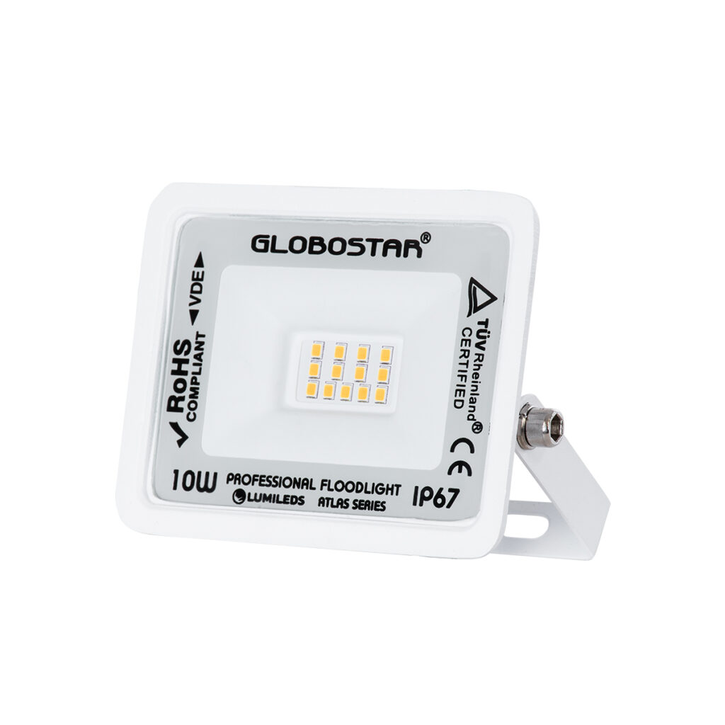 GloboStar® ATLAS 61406 Επαγγελματικός Προβολέας LED 10W 1150lm 120° AC 220-240V – Αδιάβροχος IP67 – Μ10 x Π2 x Υ8cm – Λευκό – Θερμό Λευκό 2700K – LUMILEDS Chips – TÜV Rheinland Certified – 5 Years Warranty