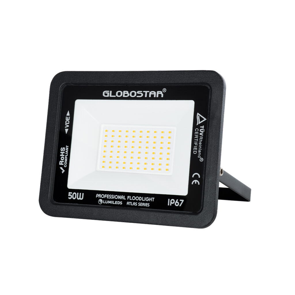 GloboStar® ATLAS 61424 Επαγγελματικός Προβολέας LED 50W 5750lm 120° AC 220-240V – Αδιάβροχος IP67 – Μ21 x Π3.5 x Υ16cm – Μαύρο – Θερμό Λευκό 2700K – LUMILEDS Chips – TÜV Rheinland Certified – 5 Years Warranty