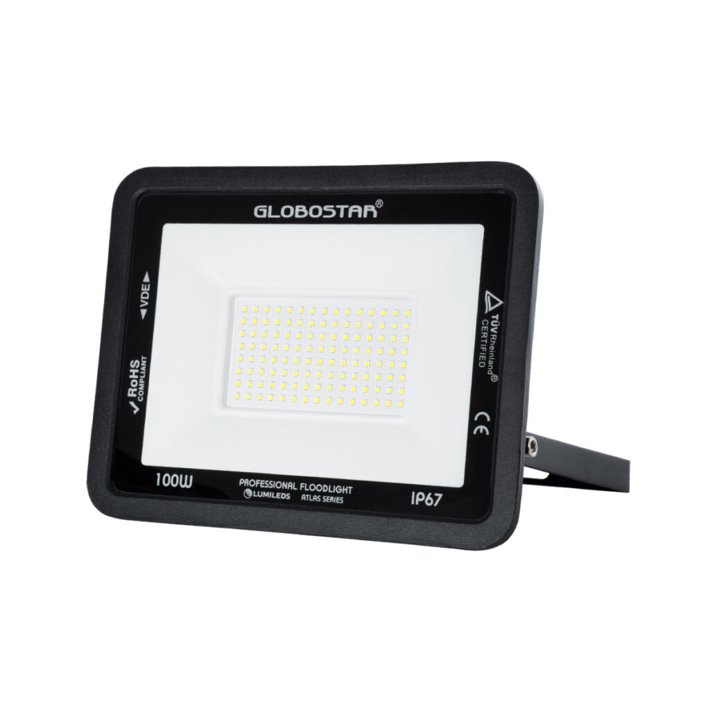 GloboStar® ATLAS 61425 Επαγγελματικός Προβολέας LED 100W 12500lm 120° AC 220-240V – Αδιάβροχος IP67 – Μ27 x Π4 x Υ21cm – Μαύρο – Ψυχρό Λευκό 6000K – LUMILEDS Chips – TÜV Rheinland Certified – 5 Years Warranty