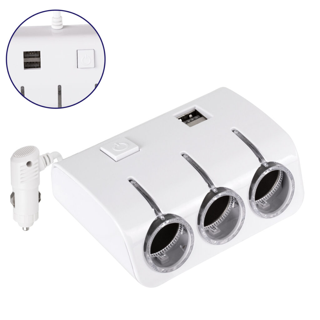 GloboStar® 81807 Πολύπριζο – Φορτιστής Αυτοκινήτου 2 x USB 3.1A & 3 x Θύρες Αναπτήρα Αυτοκινήτου DC 12-24V Max 60W Μαύρο Λευκό