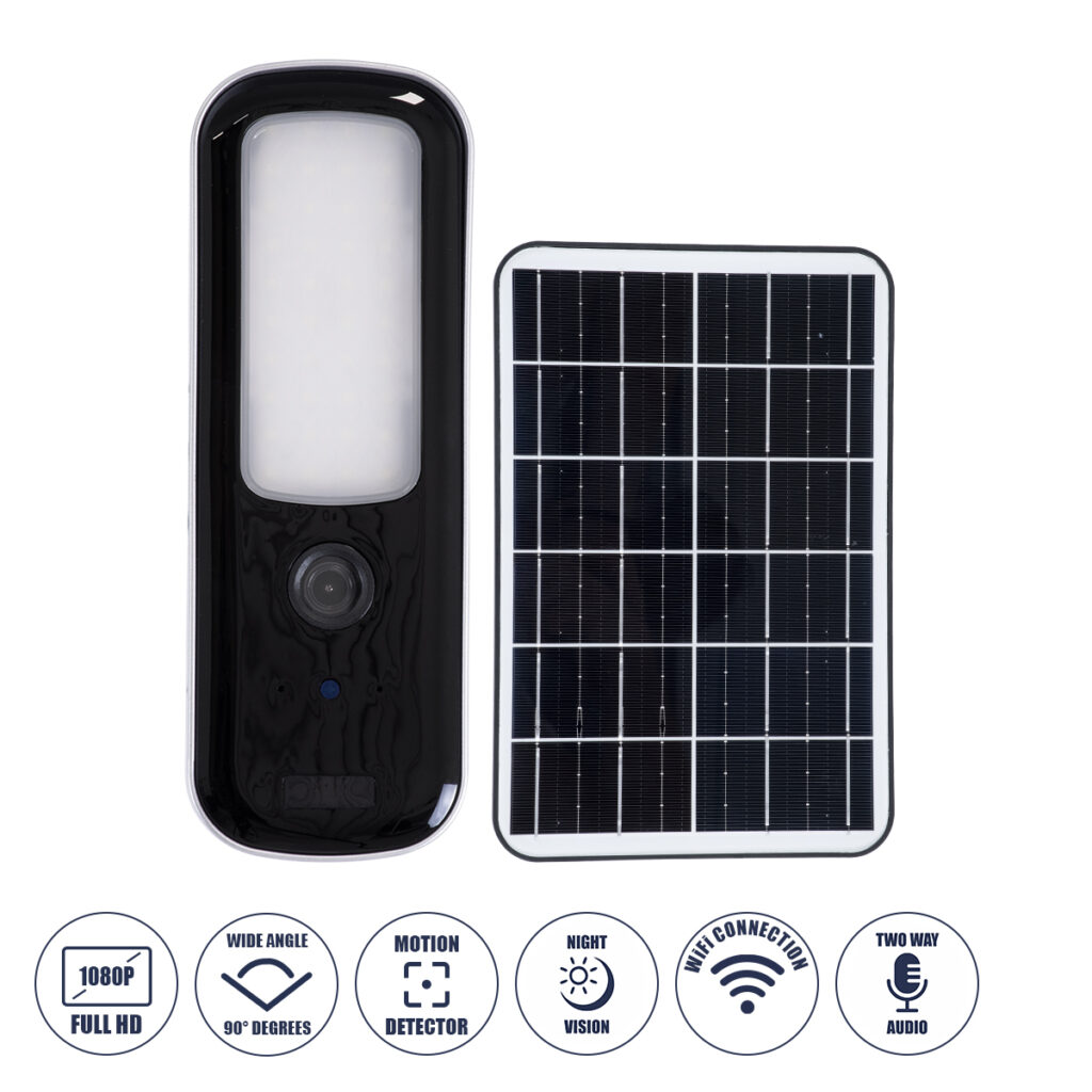 GloboStar® 86073 Αυτόνομος Ηλιακός Επιτοίχιος Προβολέας LED SMD 12W 600lm με IP Camera 1080P 2MP WiFi 150° Μοιρών – Ενσωματωμένη Μπαταρία 2500mAh – Φωτοβολταϊκό Πάνελ – Αισθητήρα Ημέρας-Νύχτας & Ρύθμιση Χρόνου Ανάμματος – Αδιάβροχος IP66 Ψυχρό Λευκό 6000K